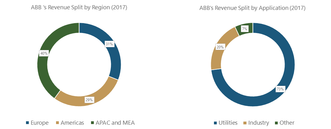 ABB’s revenue is also well distributed among different regions with around 60% coming from Europe and Americas, and the remaining 40% resulting from sales in APAC and Middle-East/Africa, an indicator of a strong relations with customers in all these regions. From an application perspective, ABB’s Power Grids division is getting most of its revenue from sales to utilities at around 73% of the group’s revenue with another 20% to heavy industries, in line with the industry average.